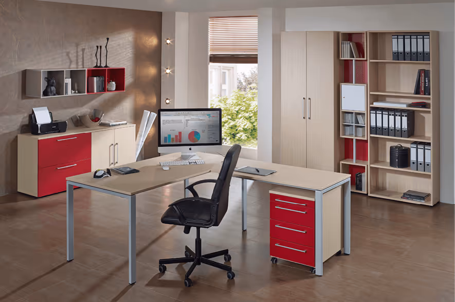 Bürotisch elektrisch höhenverstellbar mit passenden Regalen und Rollcontainer