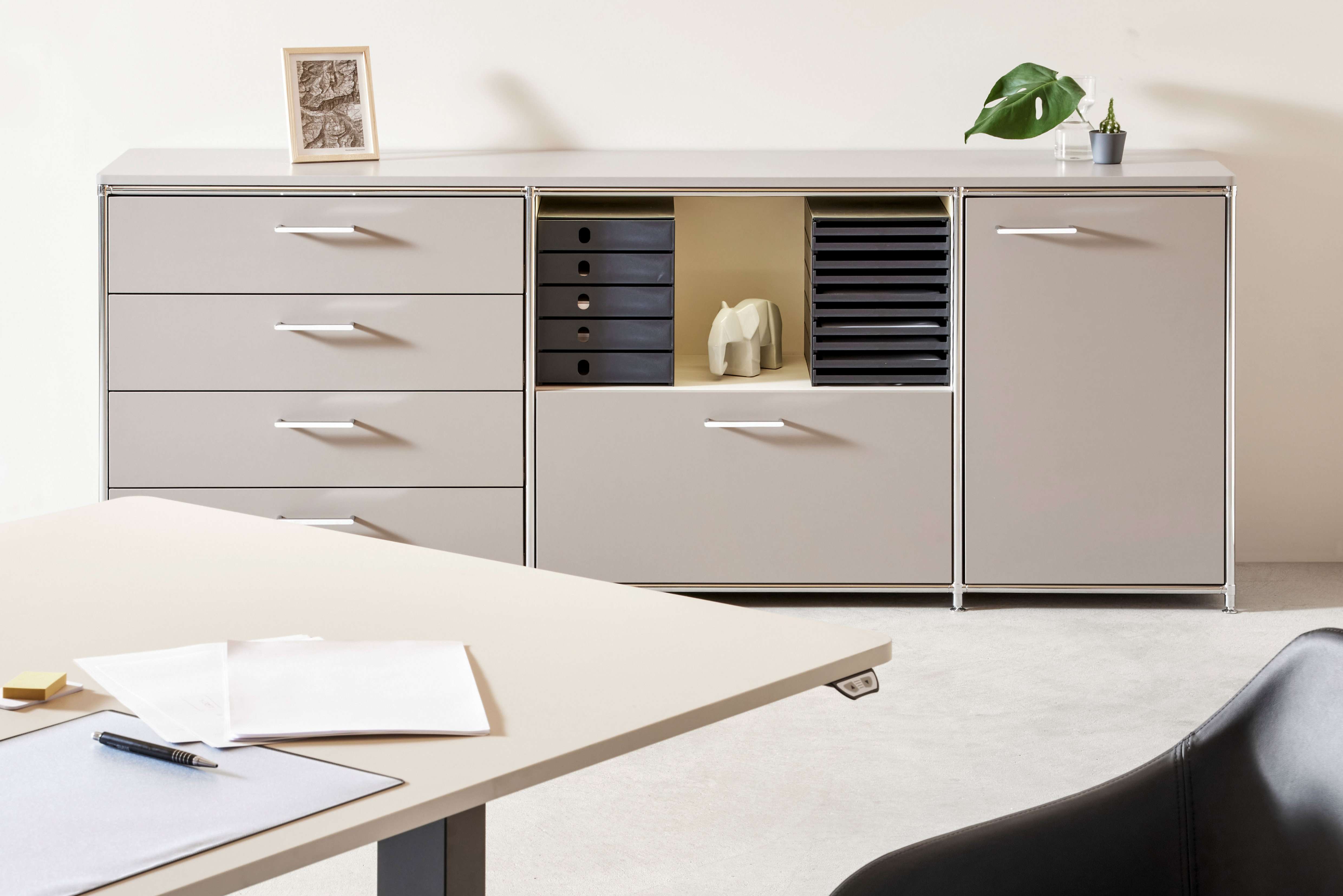 Büroprogramm Celton erhältlich in vielen verschiedenen Lack- und Glasfarben, zudem auch verschiedene Furniere zum kombinieren. Das Metallgestell macht das ganze Möbelstück sehr edel.