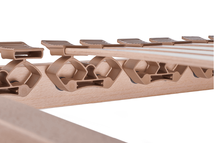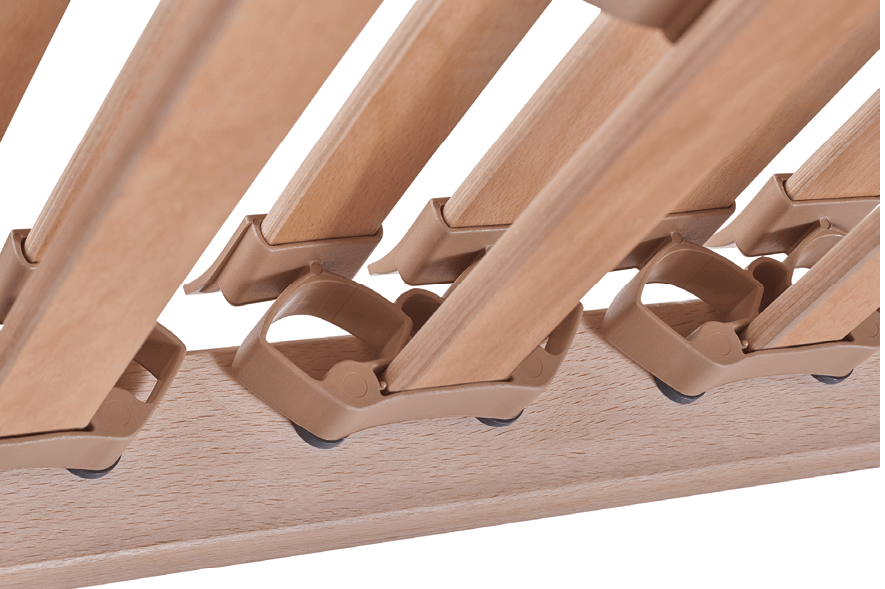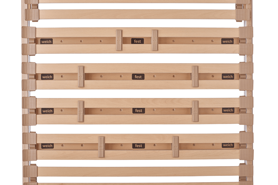 Die Untermatratze (Lattenrost) GARANT Comfort Flex besteht aus massivem Buchenholz, veredelt mit Leinöl. Die extra grosse Schulterzone mit Absenkautomatik sorgt für leichtes Einsinken der Schulterpartie. In der Mittelzone können Sie progressiv die Festigkeiten im Becken- und Lordosebereich einstellen.
