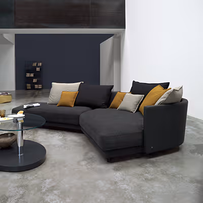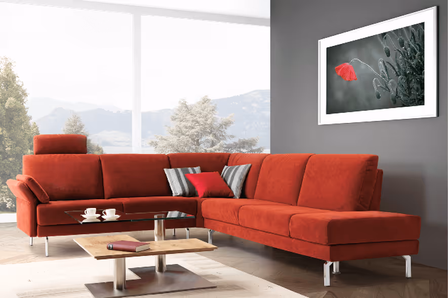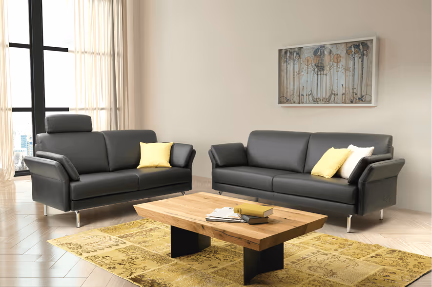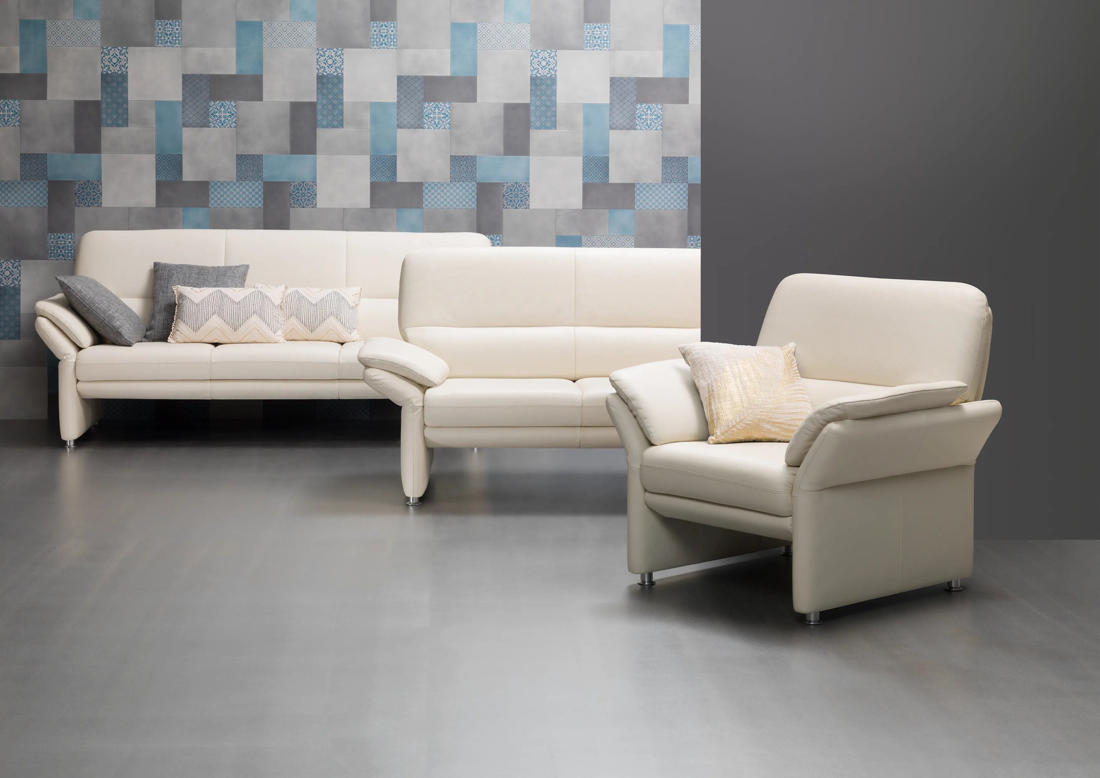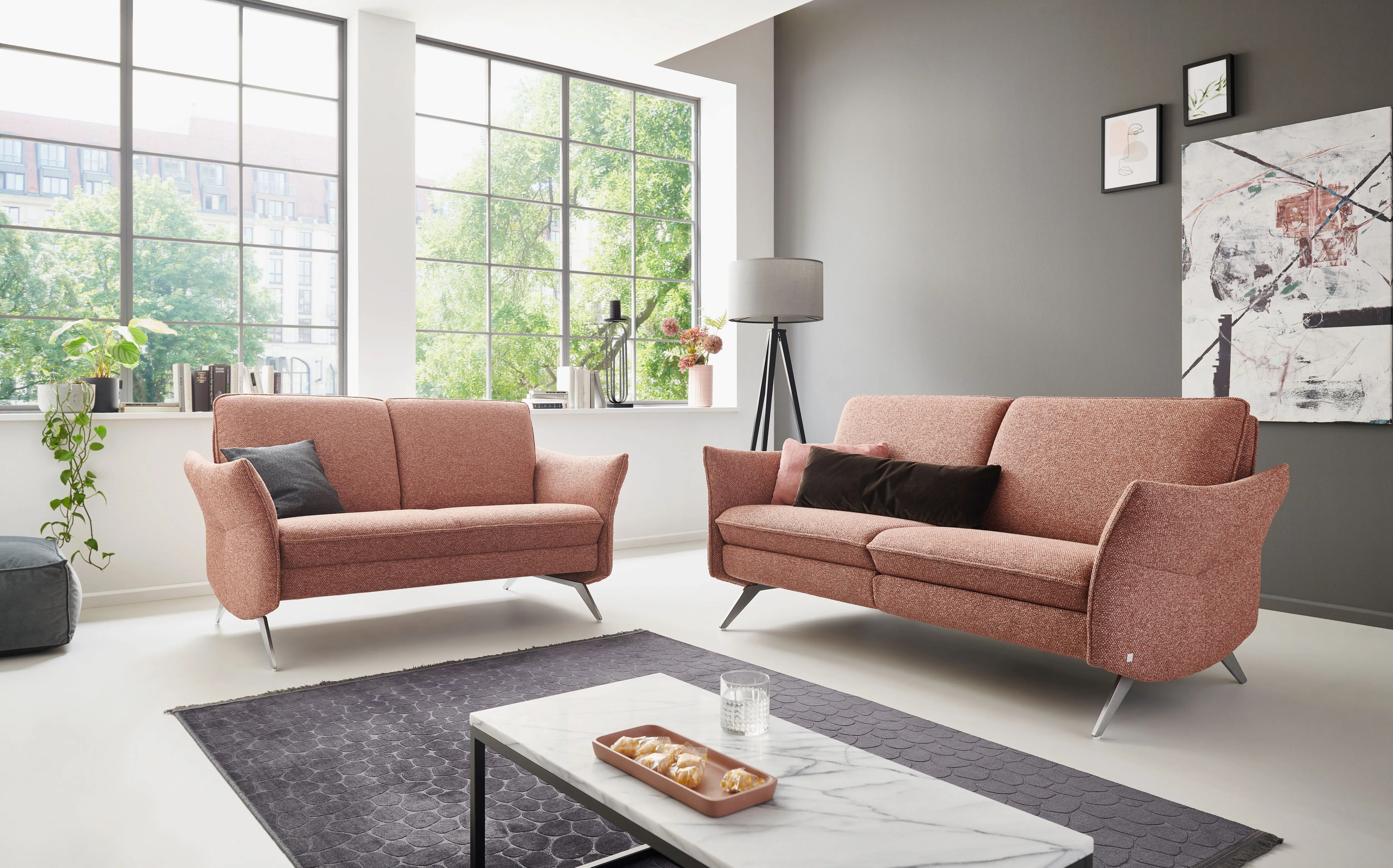 Das Modell ist in Leder und Stoff erhältlich und auch als Eck- oder Longchairgarnitur zusammenstellbar.