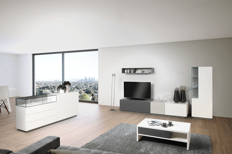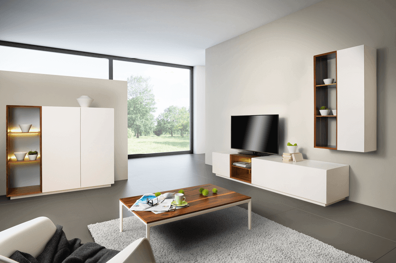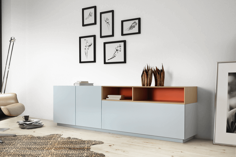 Die Wohnkombination kann nach Lust und Laune zusammengestellt werden. Wählen Sie zwischen verschiedenen Lack- und Glasfarben und Hölzern und stellen Sie ihr passendes Wohnprogramm oder Sideboard zusammen.