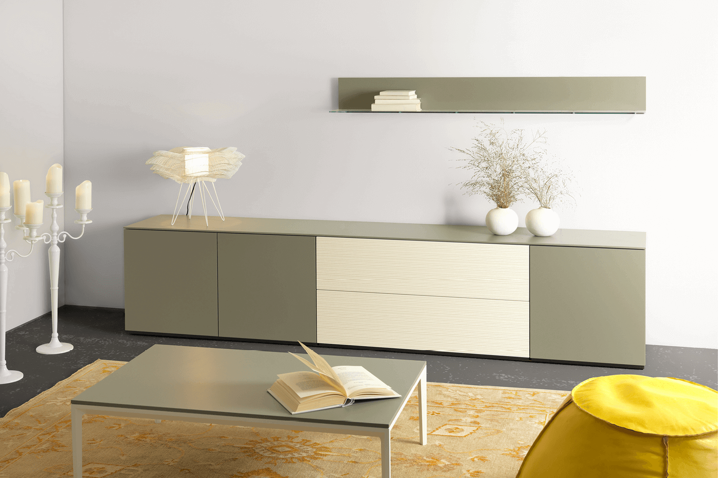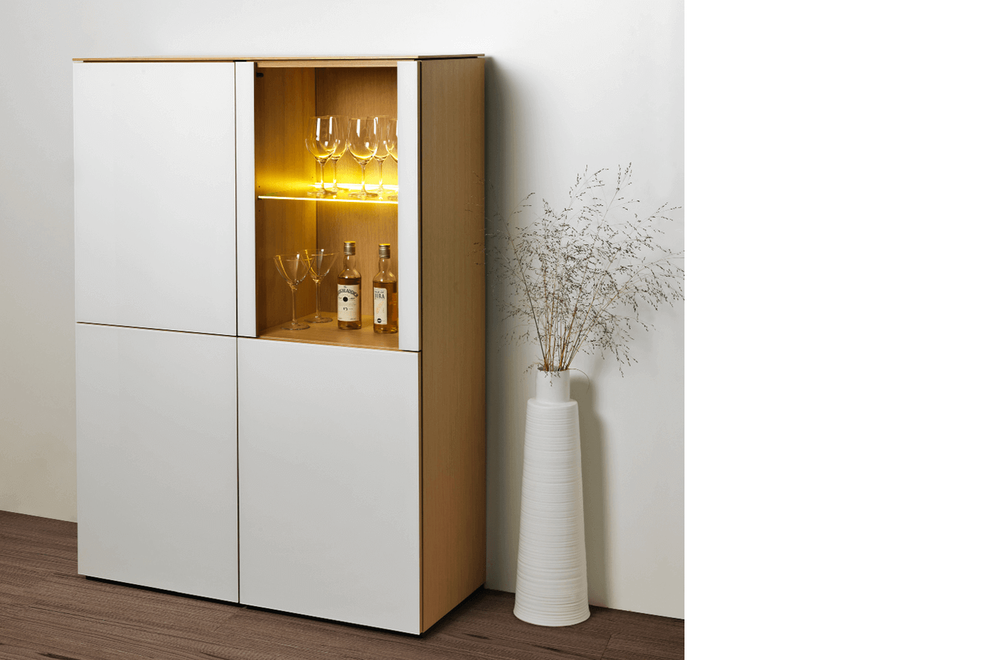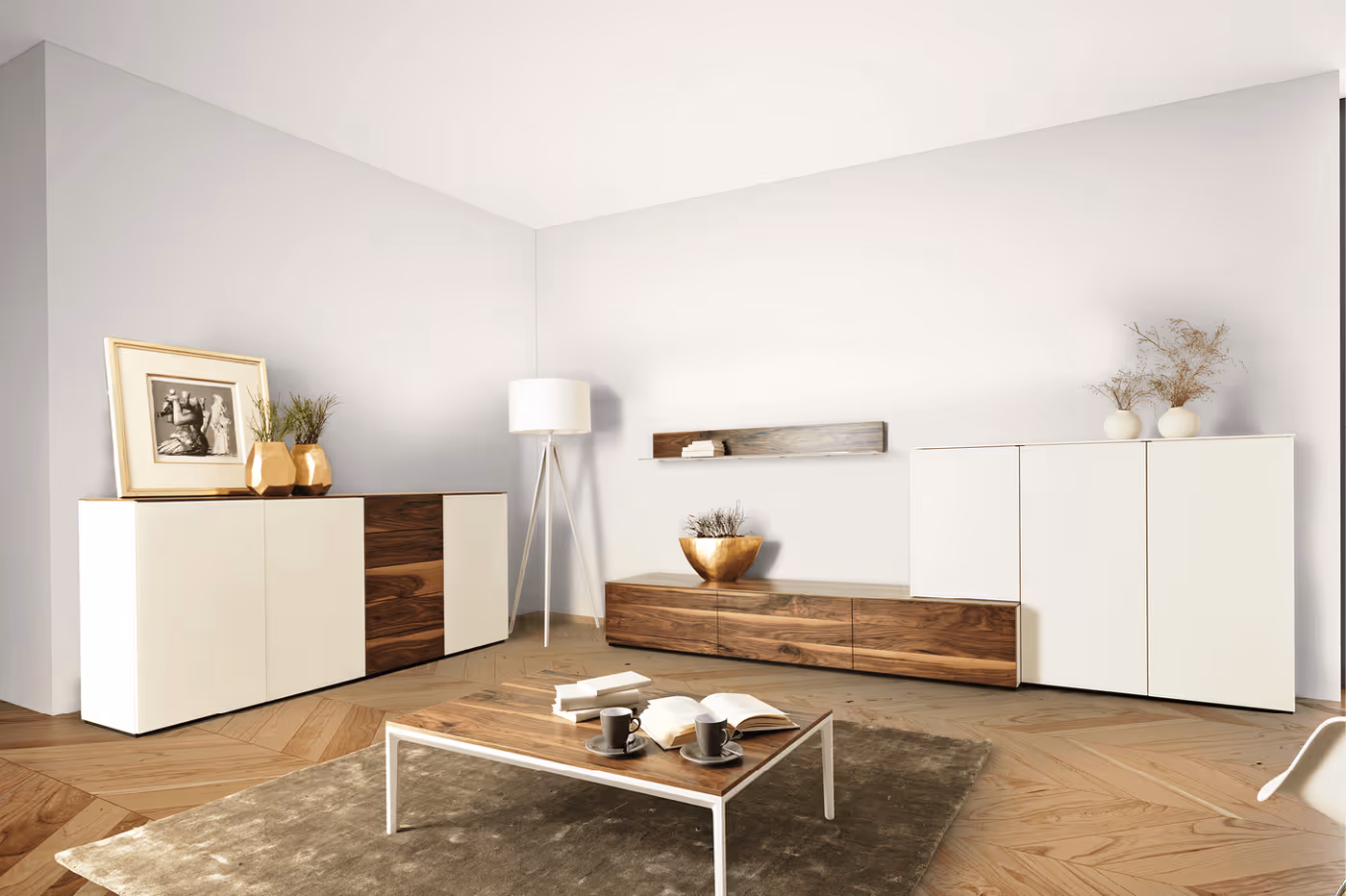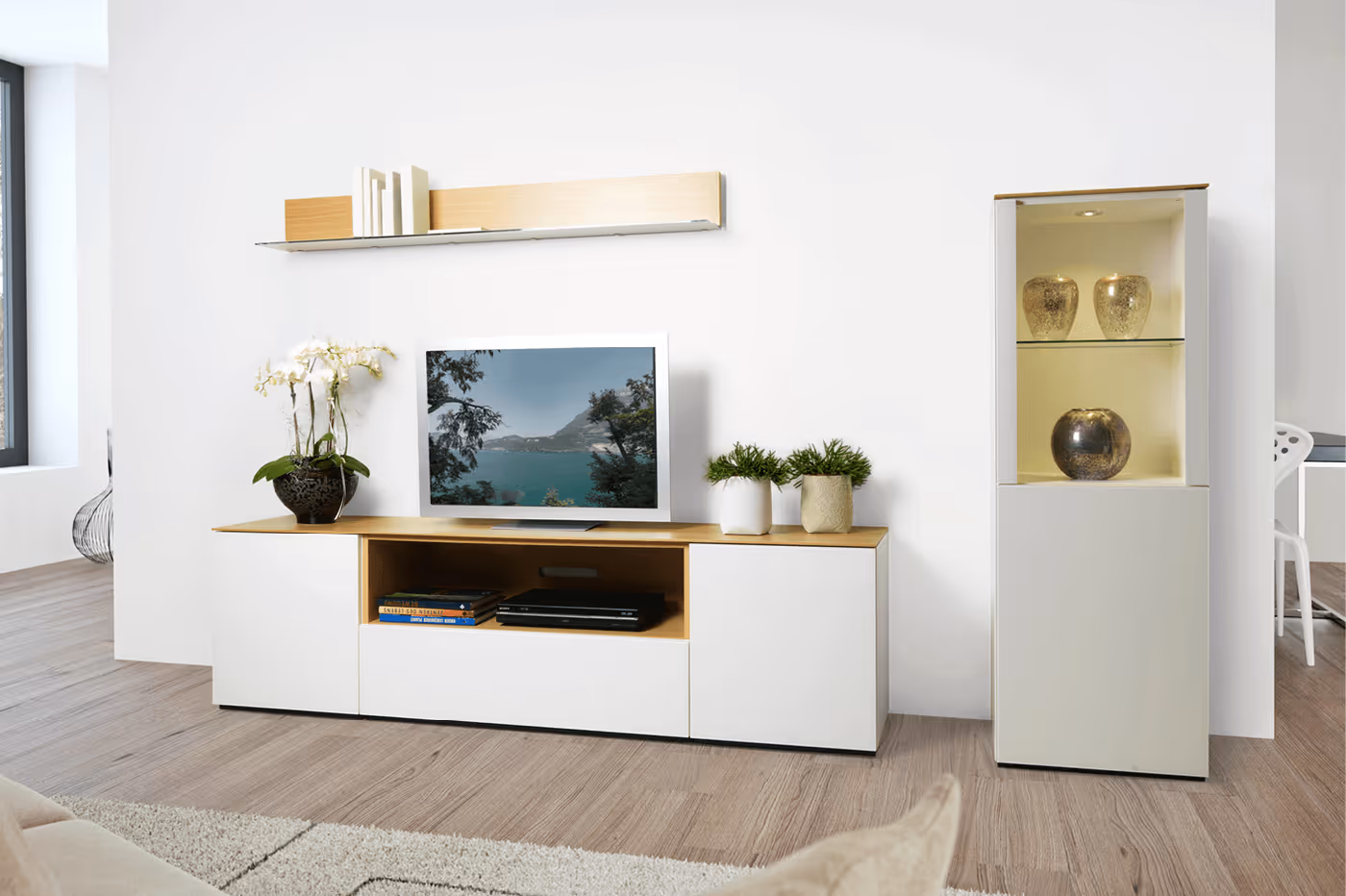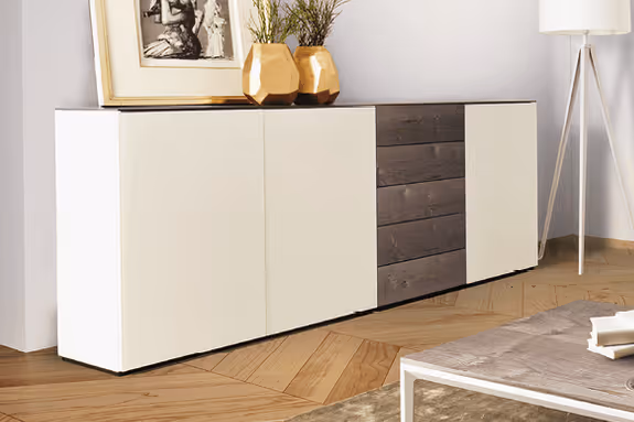 Die Wohnkombination Timber ist beliebig zusammenstellbar. Kombinieren Sie verschiedene Lack- und Glasfarben sowie Holzarten passend für Ihr zu Hause.