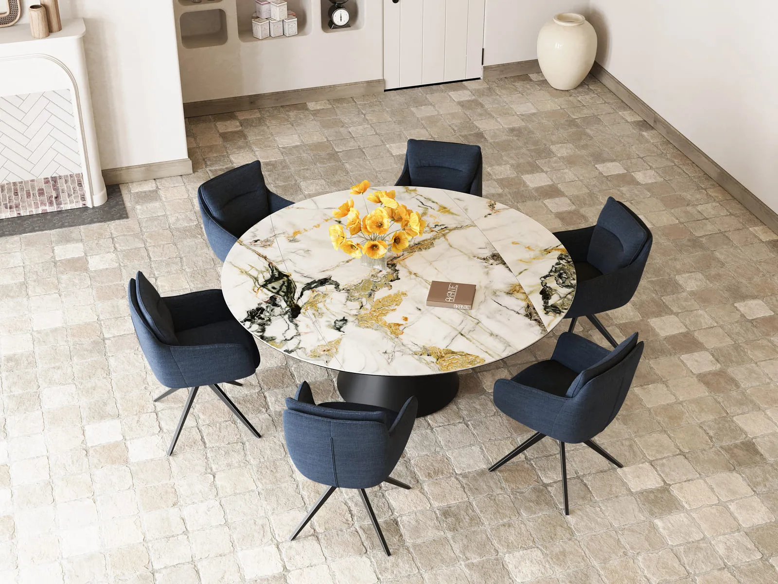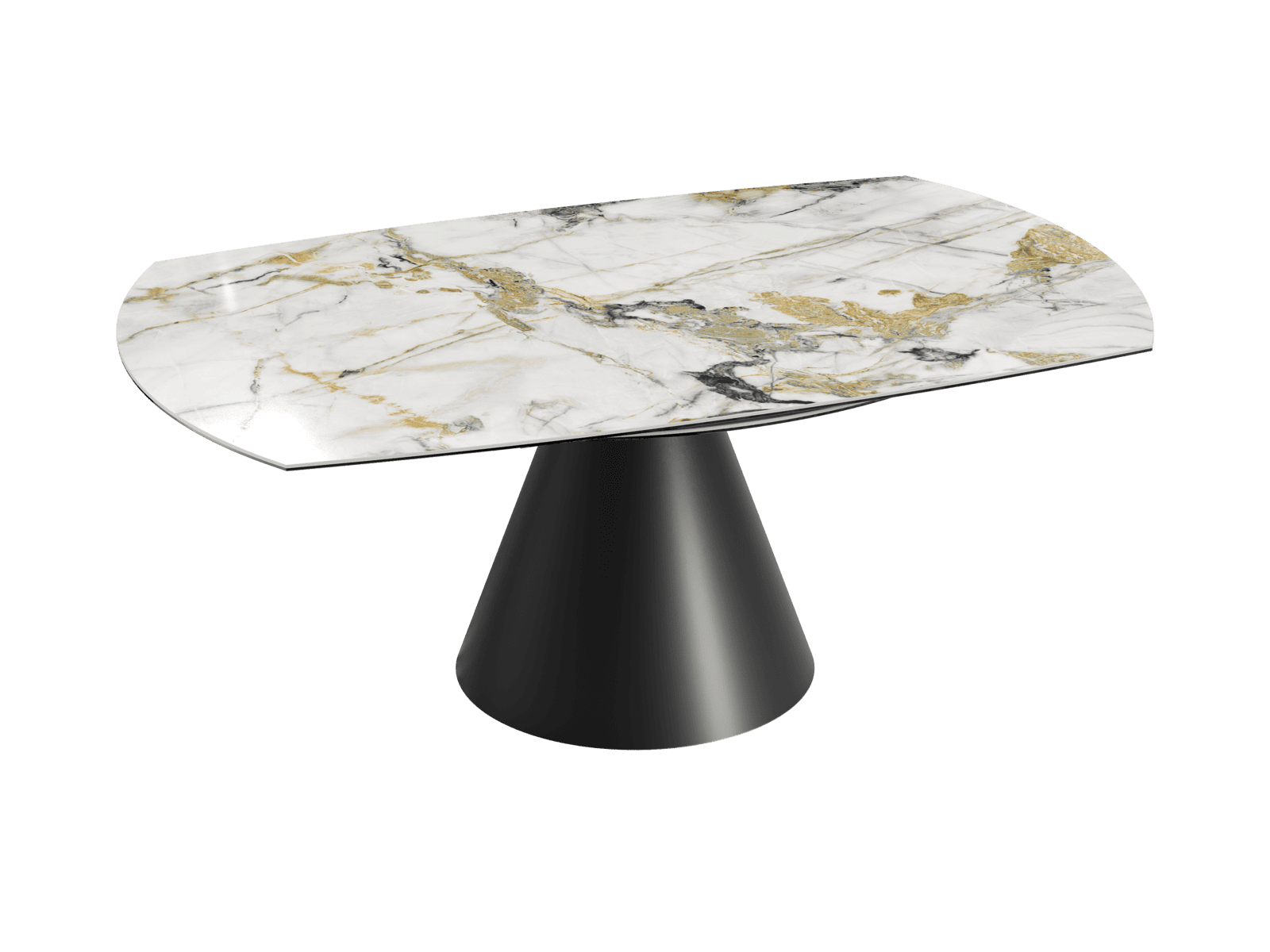 Keramiktisch in Bootsform, der sich ganz leicht in einen grossen runden Tisch verwandeln lässt. Fuss in Metall schwarz, Keramik in verschiedenen Ausführungen erhältlich.