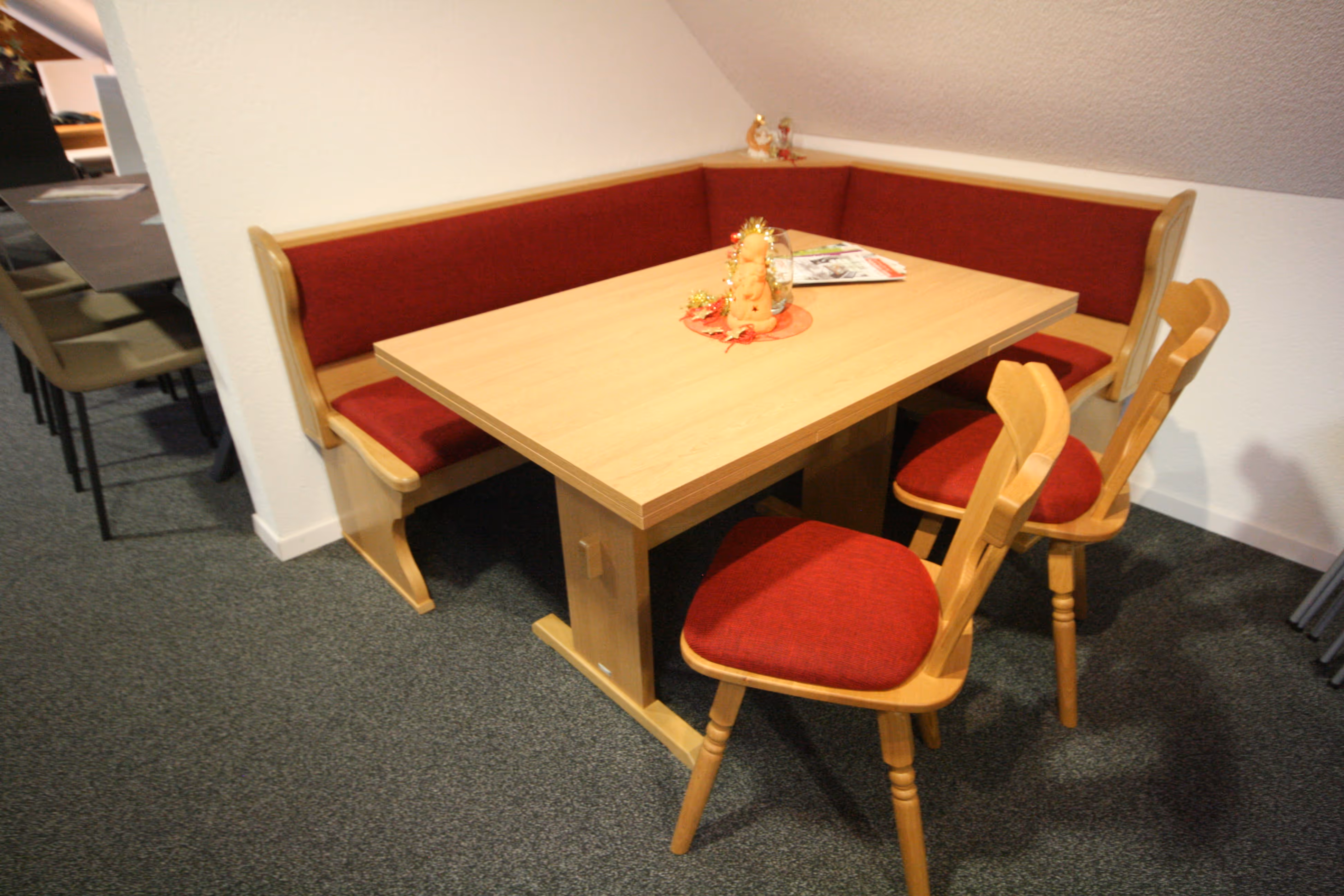Eckbankgarnitur in Eiche furniert, Stoff rot, 140cmx180cm, Tisch mit auszügen 120cmx80cm, 2 Stühle