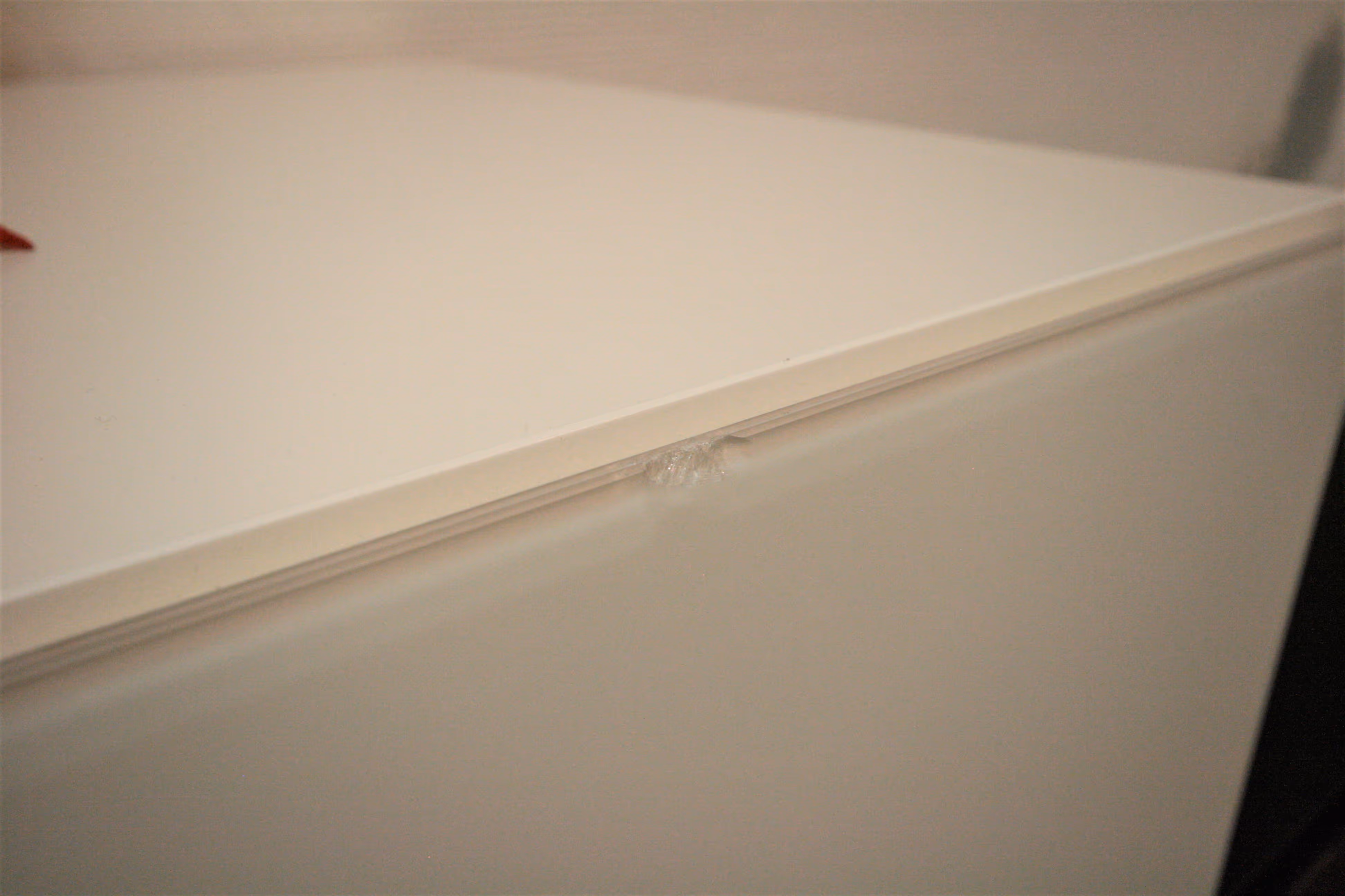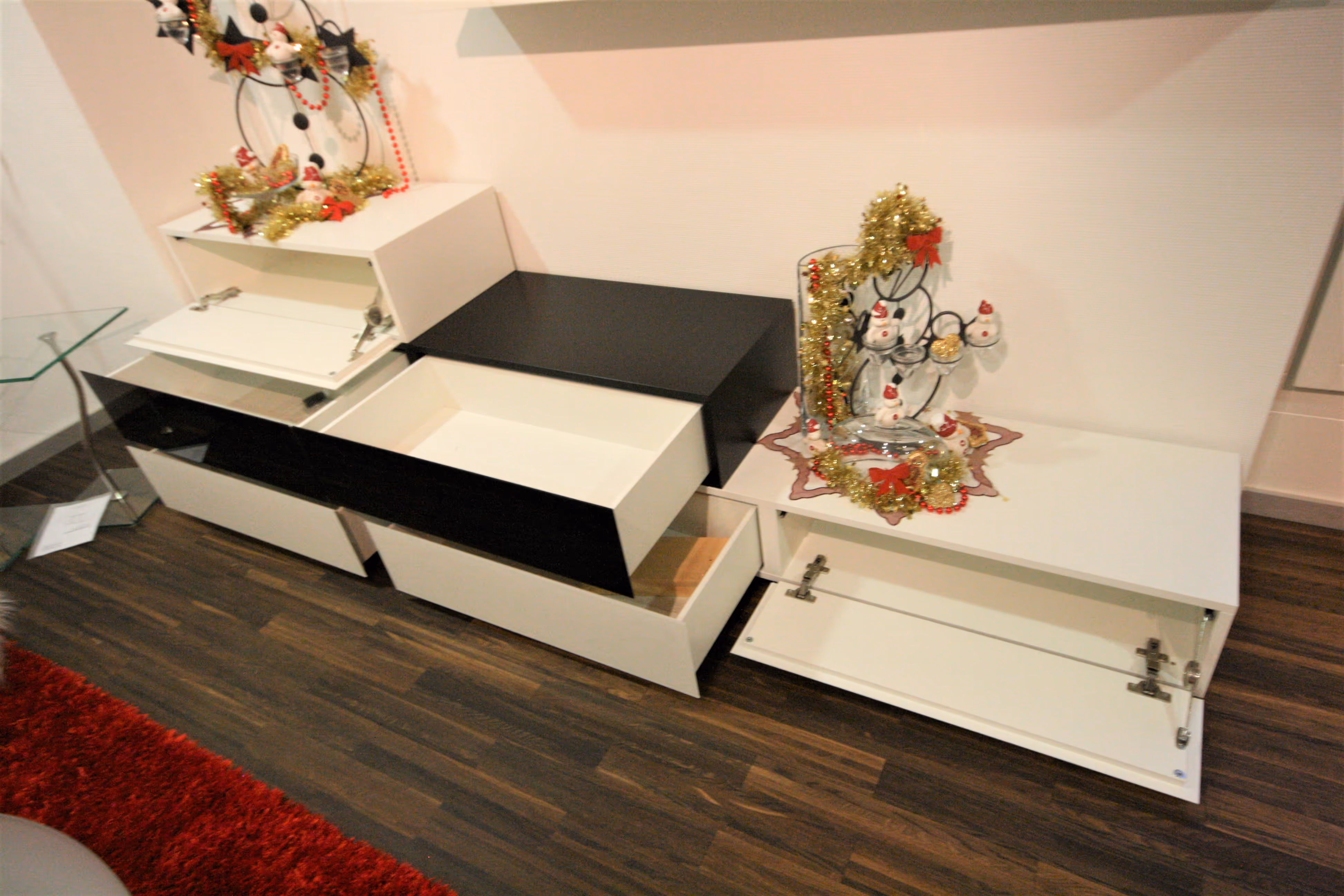 Lowboard in Lack weiss und schwarz, Front Glas, Klappen und Schubladen, schiebbar in der Breite
