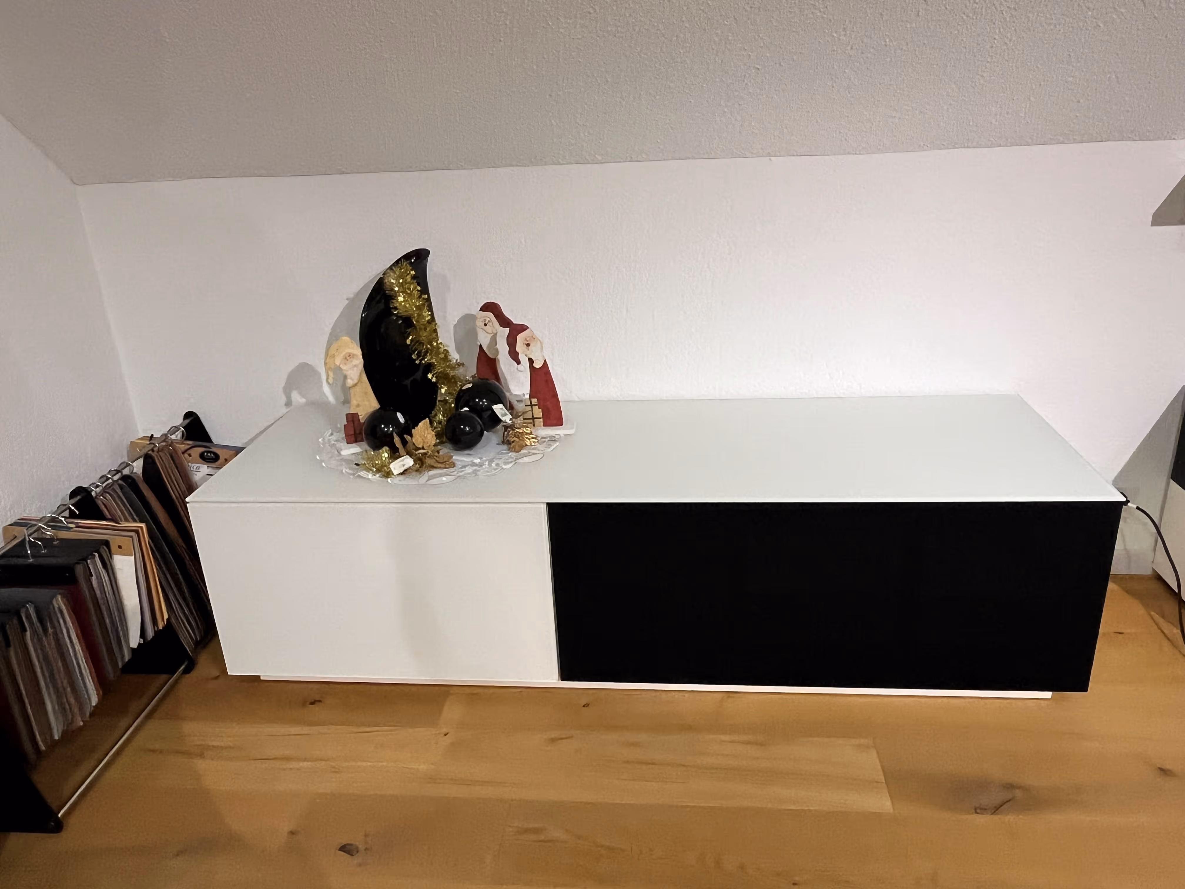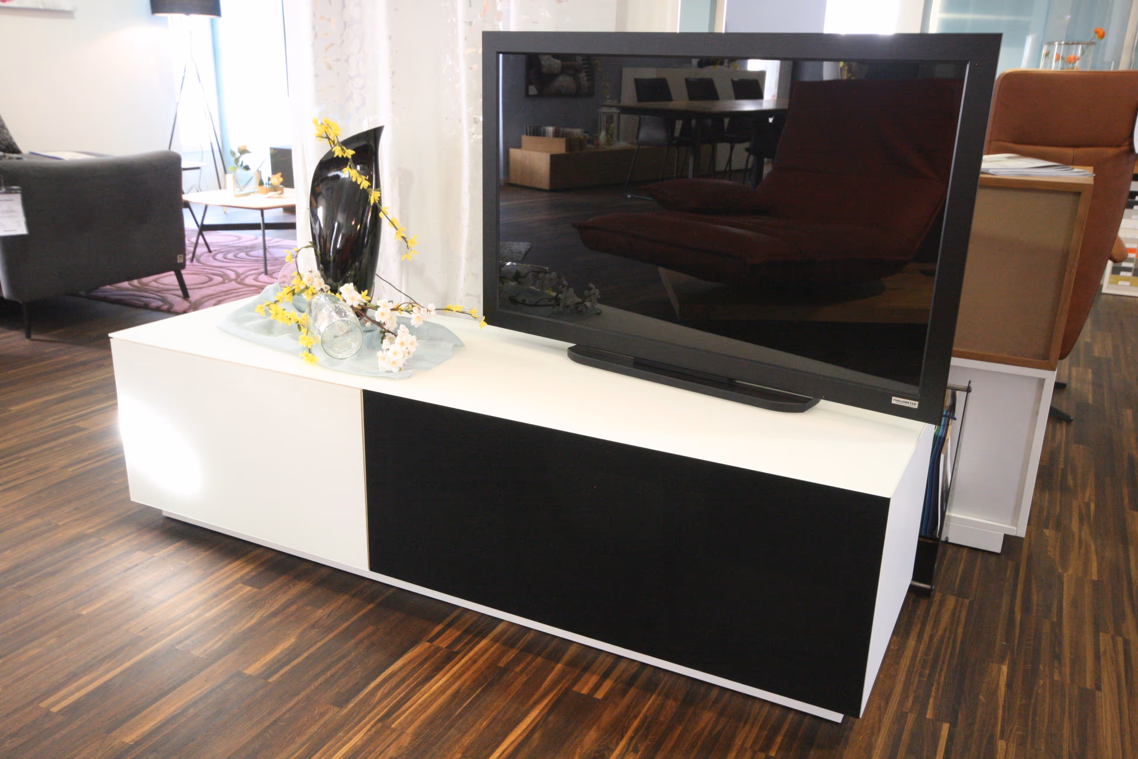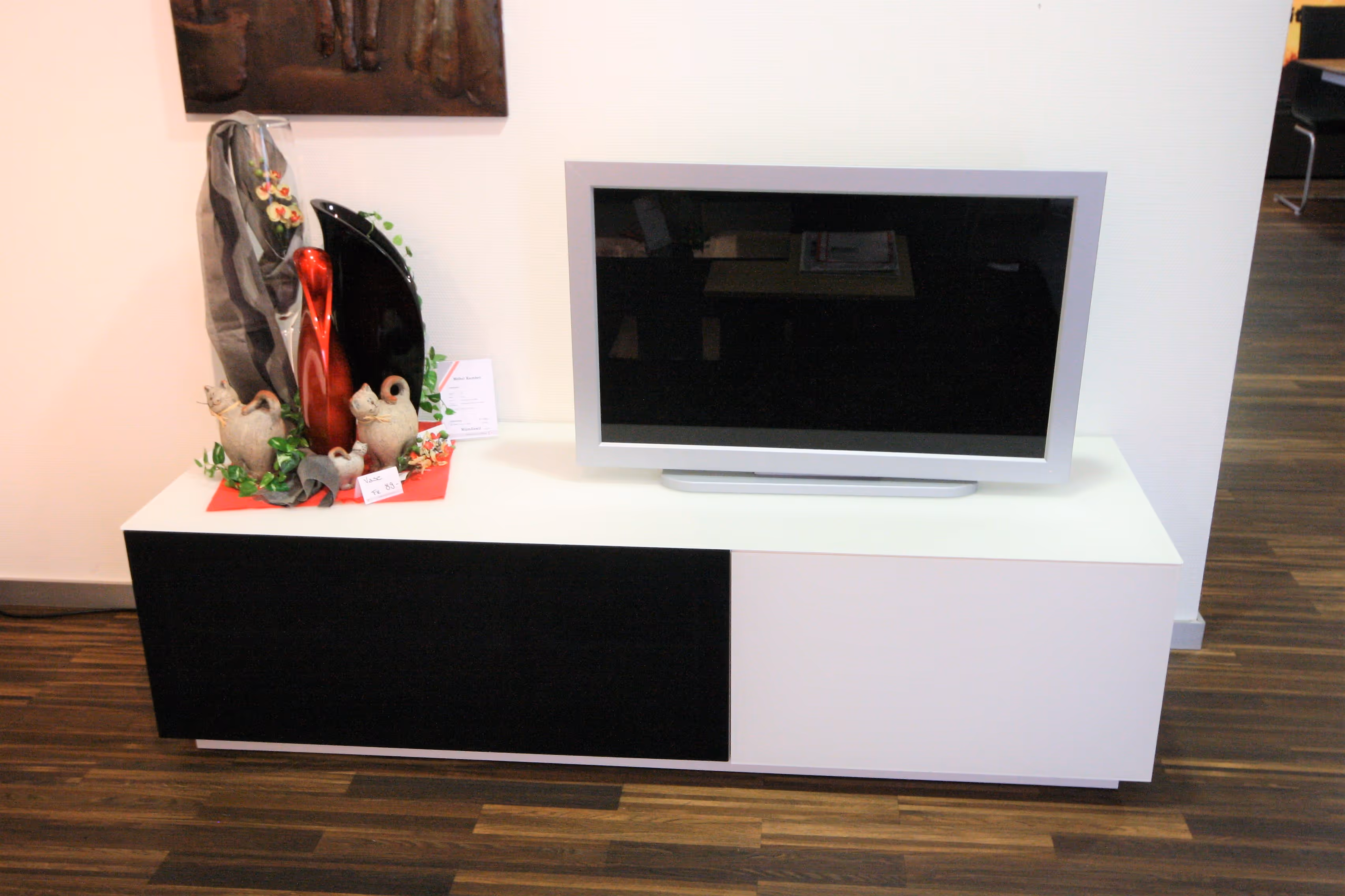 Lowboard in Lack weiss und Glas matt weiss mit Akkustikklappe